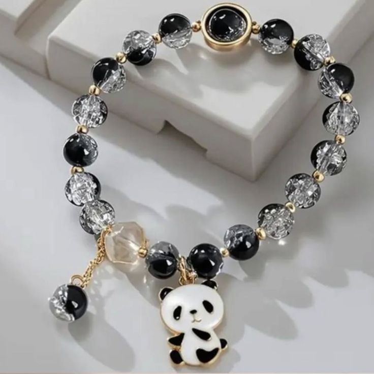 This elegant beaded bracelet features a stunning mix of black and crystal-clear beads, enhanced with golden accents for a classy finish. The cute panda charm adds a playful and unique touch, making this bracelet stand out. Lightweight and comfortable to wear, it is perfect for daily use and special occasions. Its stylish and charming design makes it an ideal gift choice for panda lovers and fashion jewelry fans. 🐼✨